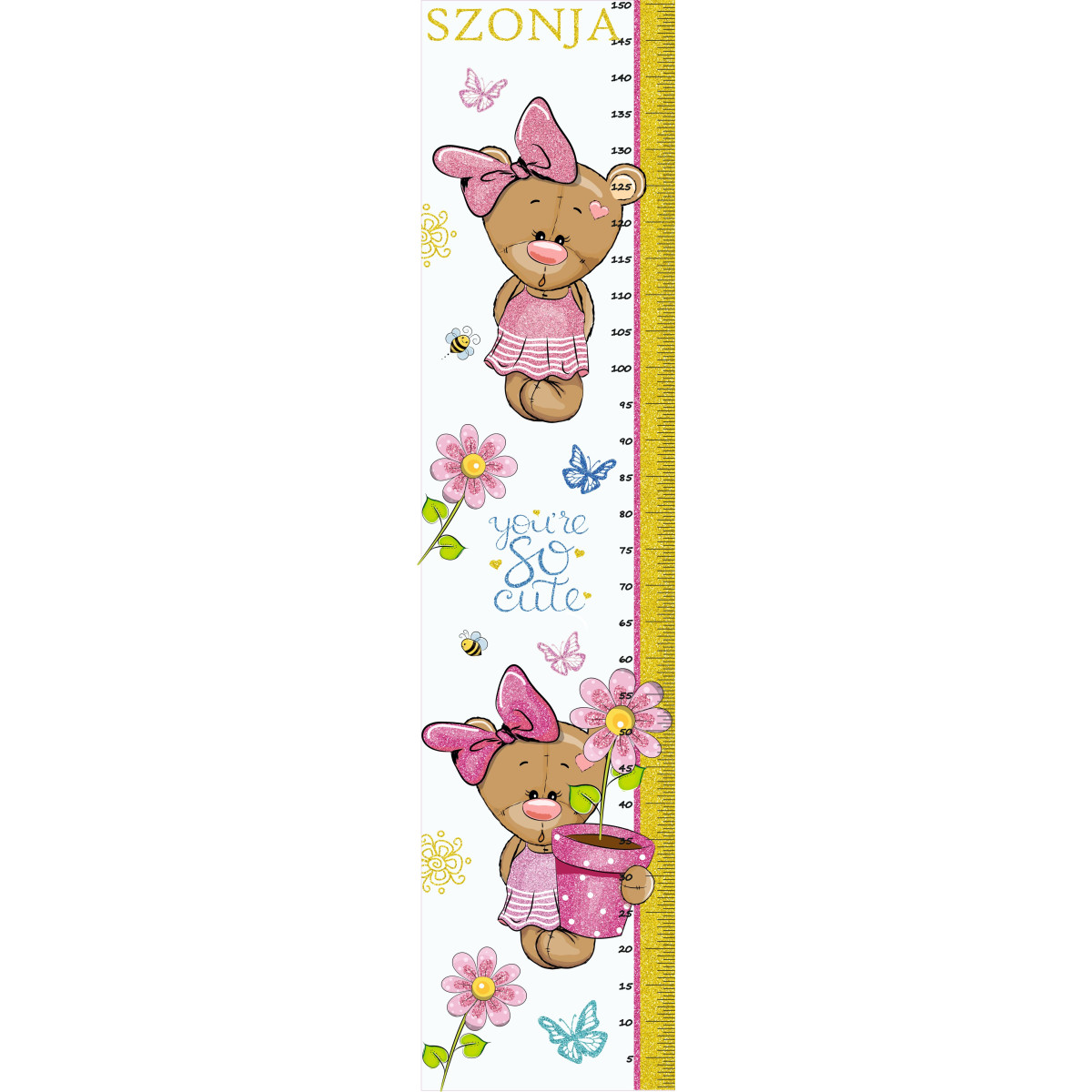 Kislány maci virággal, pink, arany színű glitteres magasságmérős falmatrica, névre szóló | 35 cm x 150 cm