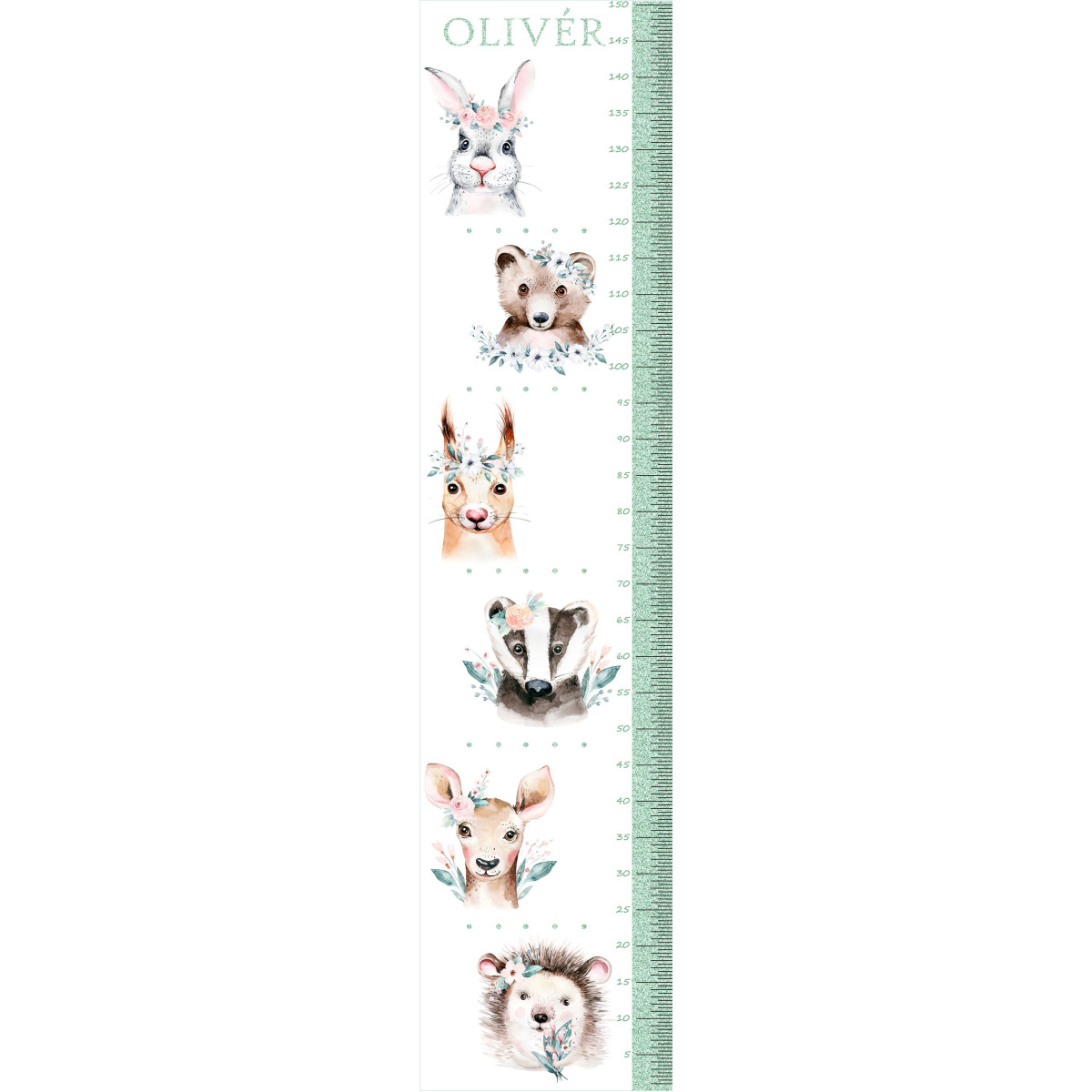 Saját neves magasságmérős falmatrica, erdő állata: nyuszi, sün, borz, őzike, medve, mókus