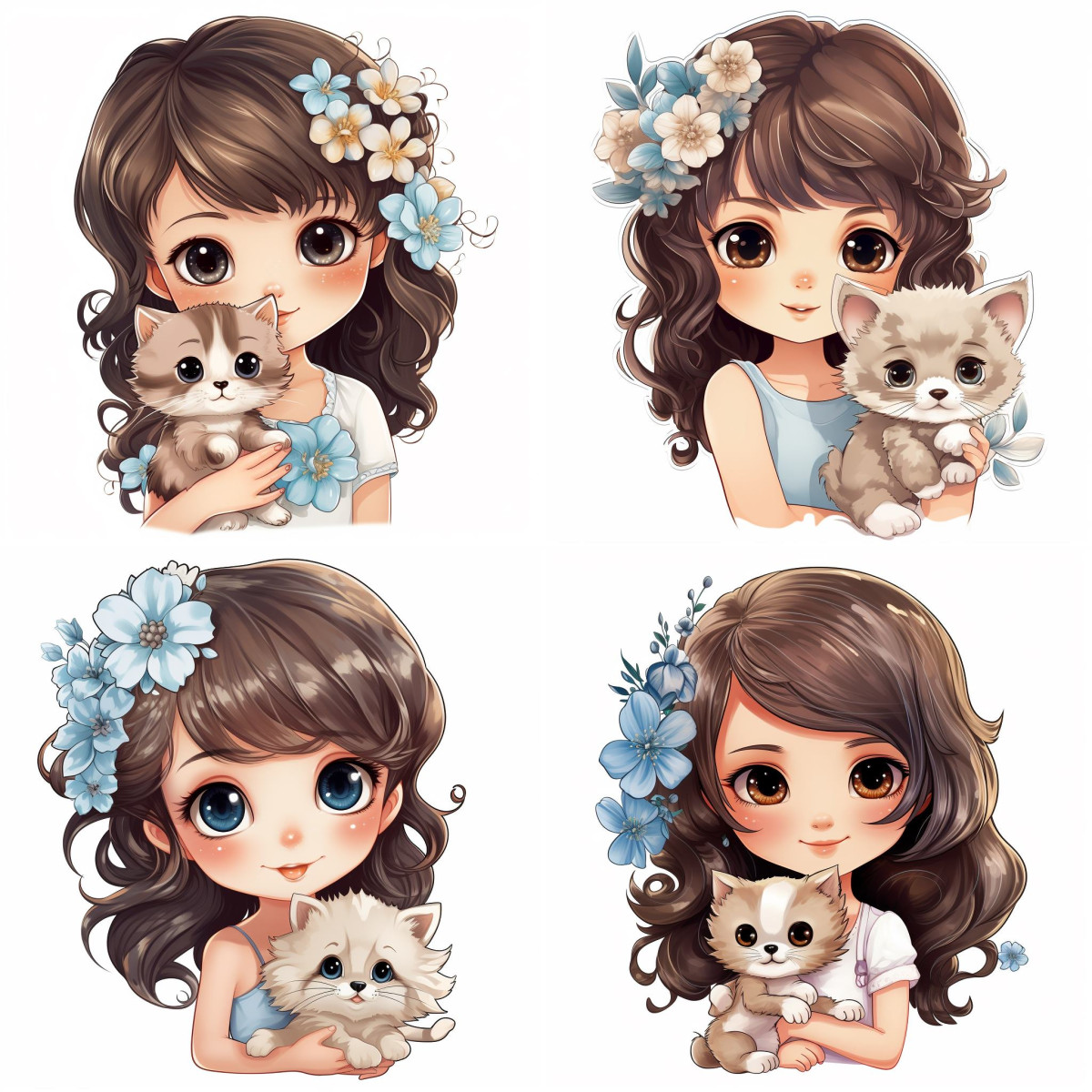 Barna, hosszú hajú lány kék virágokkal a hajában, cicával Gyerekszoba Falmatrica kislány szobába!