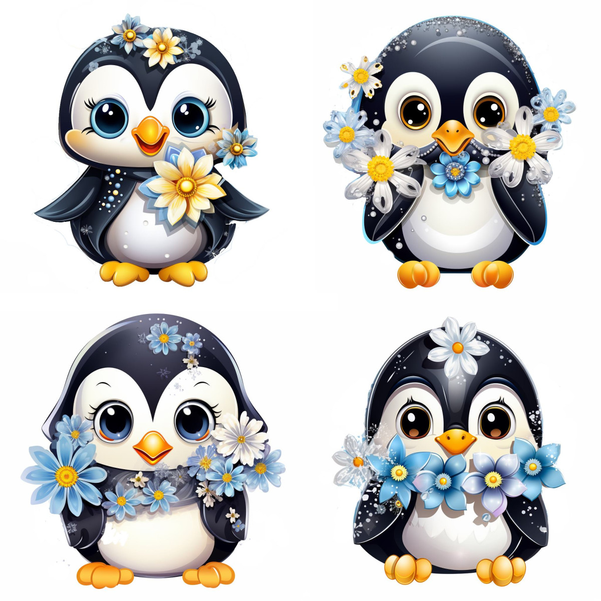Pingvin kék és sárga virágokkal gyerekszoba falmatrica