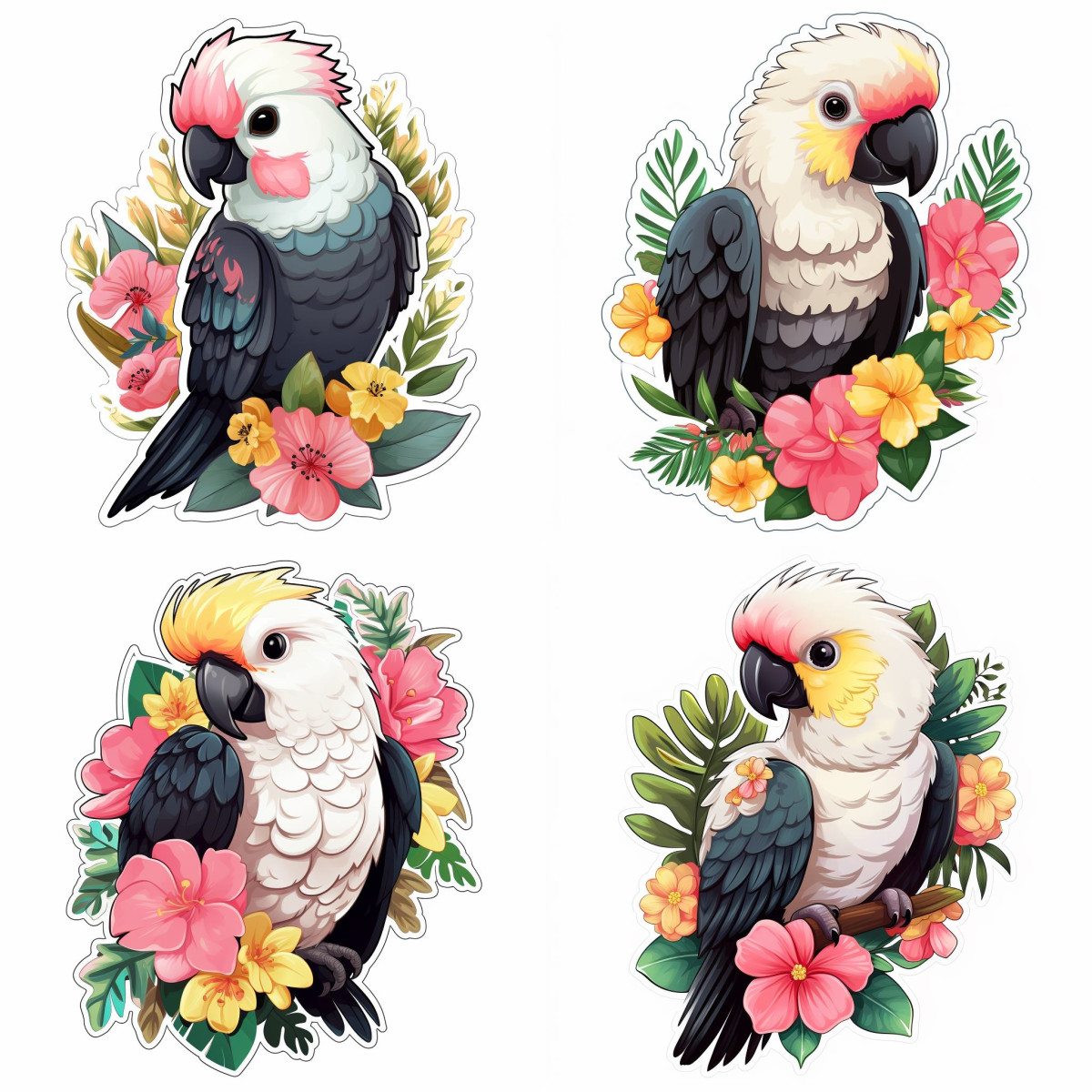 Kakadú Papagájos faldekoráció, fekete-fehér,. sárga és fehér bóbitás kakaduk, színes virágokkal papagájos falmatrica