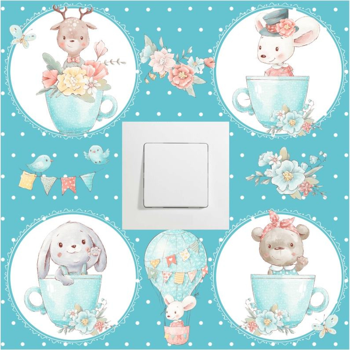 Minta: egérke, őzike, nyuszi, maci, virágok, csésze, lepke, madárka, szalag, türkiz kék, fehér pöttyös háttér