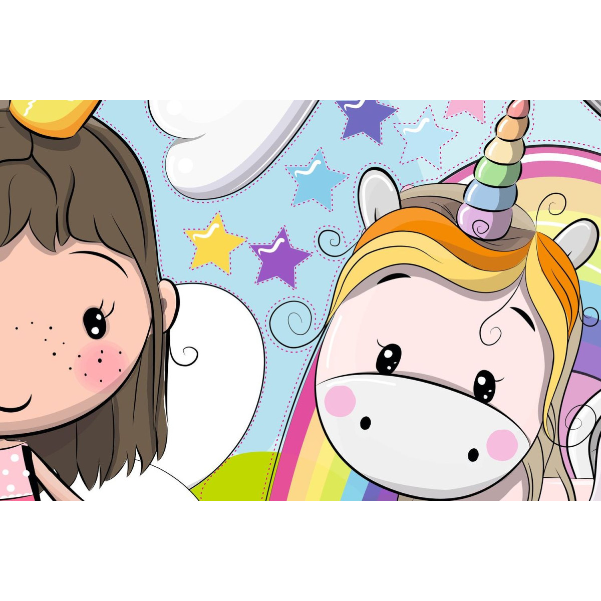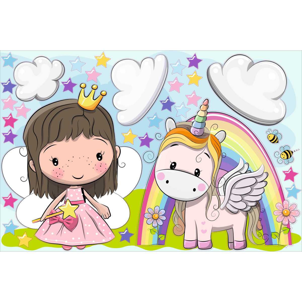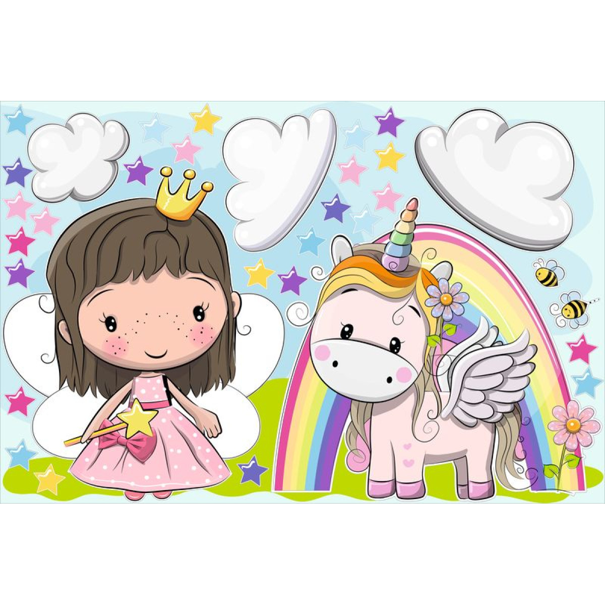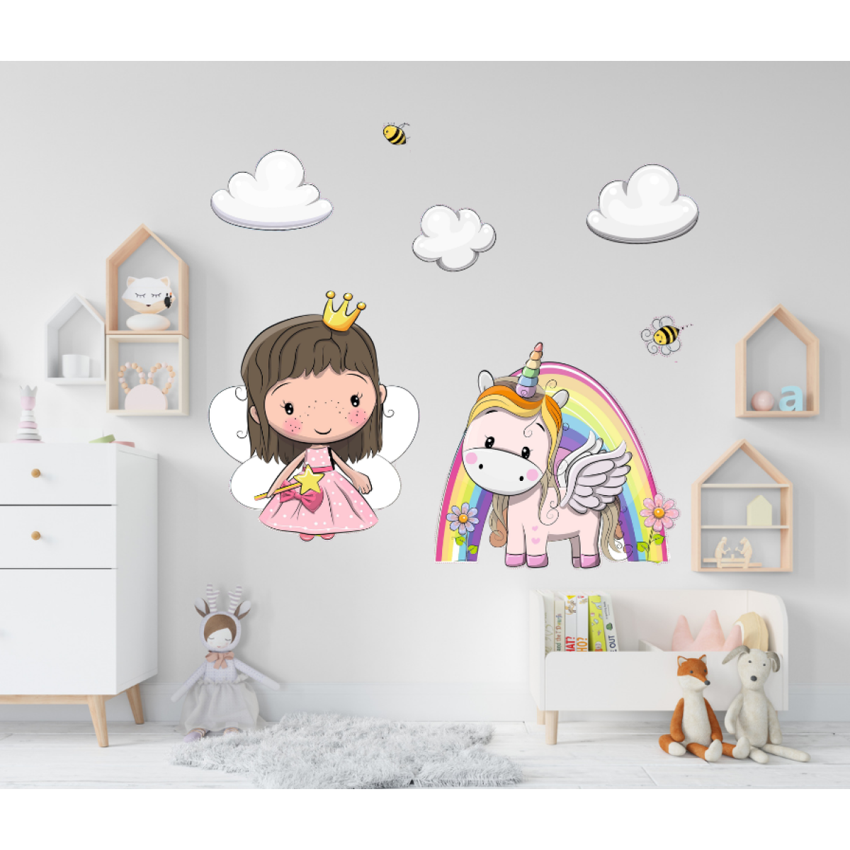 Királylány és unikornis falmatrica, pink egyszarvú és tündér lány szivárványos faldekoráció