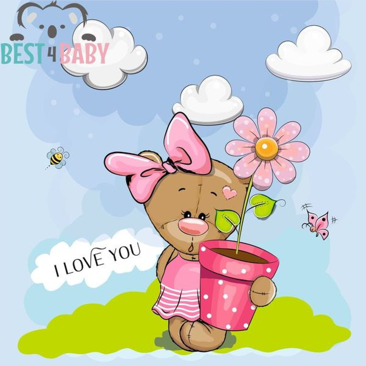Kislány maci virággal gyerekszoba poszter, felhők, kék ég alatt poszter, I Love You felirattal