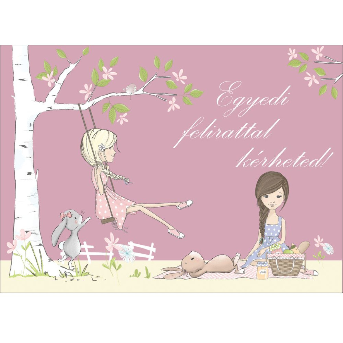 Kislány hintázik, barátnőjével és nyuszikkal lány poszter, választható felirattal