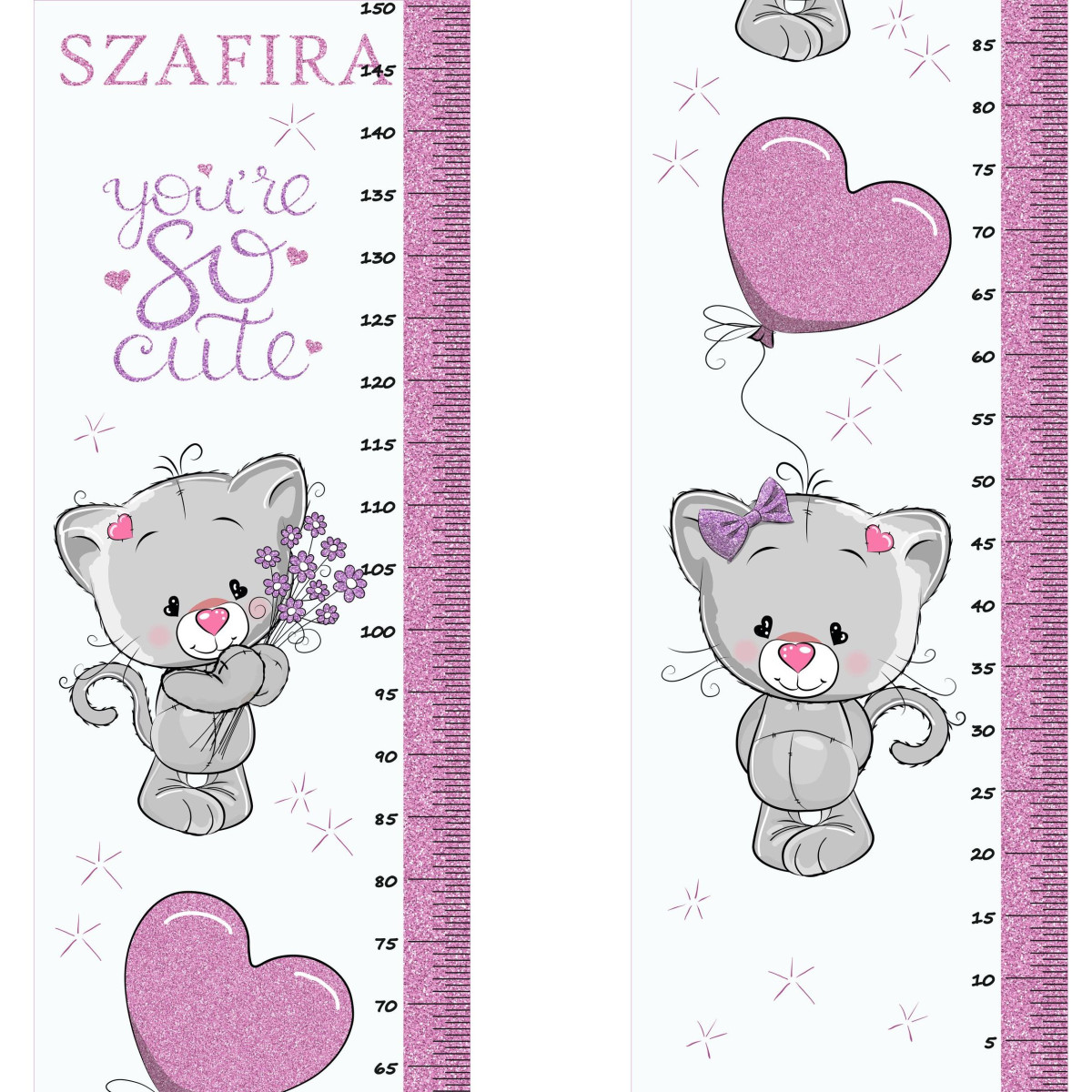 Saját neves magasságmérős falmatrica, szürke cicás, csillámos, glitteres mintázattal