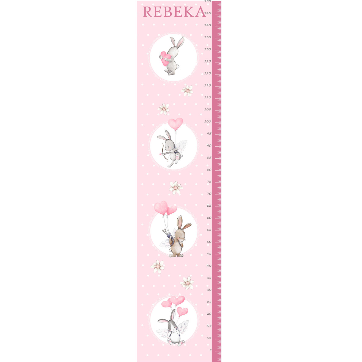 Rózsaszín, saját neves magasságmérős falmatrica, nyuszikkal és kamilla virággal, pöttyökkel
