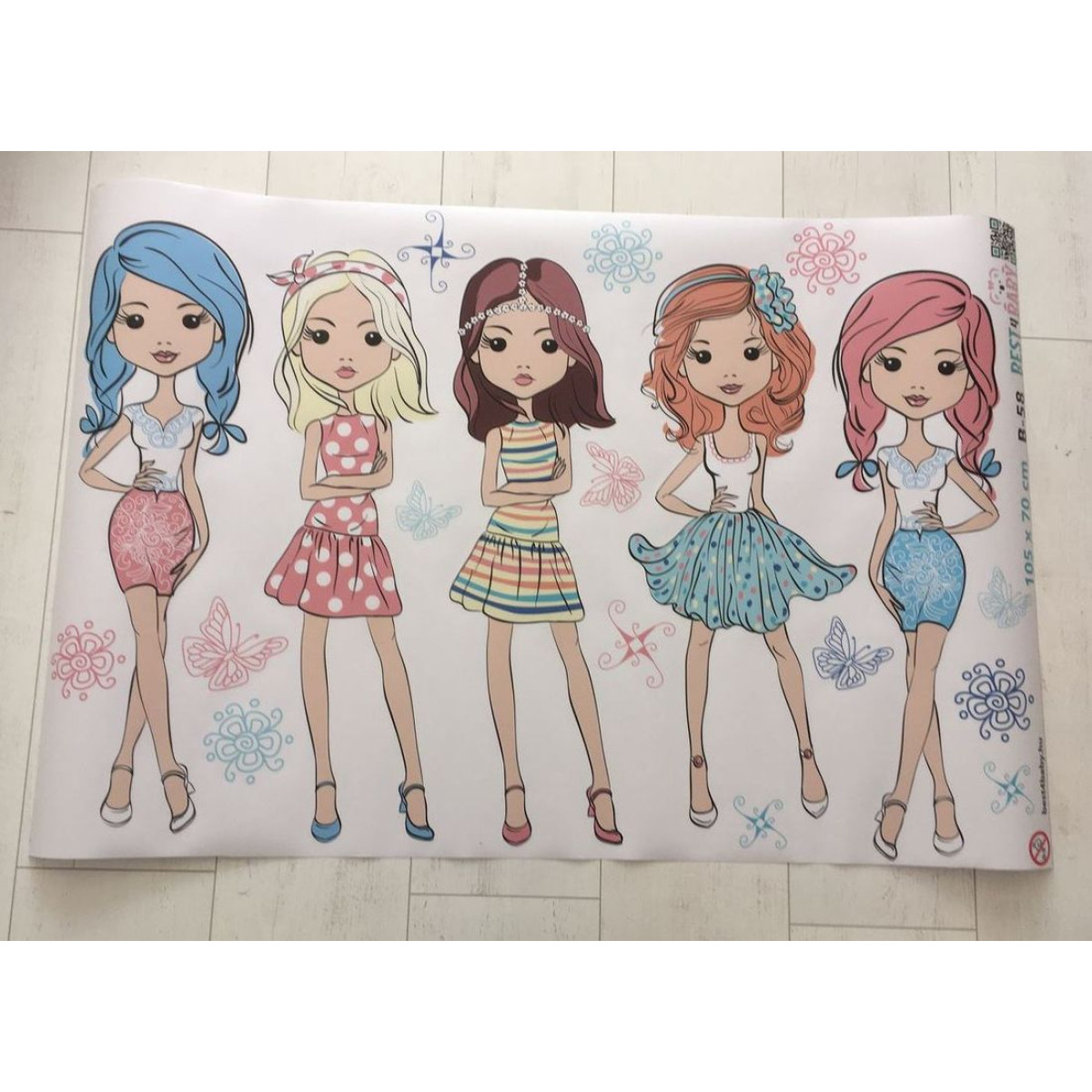 Az egyes elemek külön-külön felragaszthatók, így 5 db lány, illetve lepkék és virágok külön-külön levehetők a fóliáról.