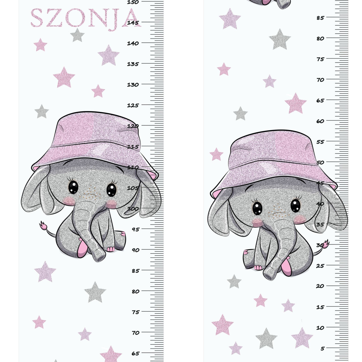 Lány elefántos, csillámos magasságmérős falmatrica, névre szóló | 35 cm x 150 cm