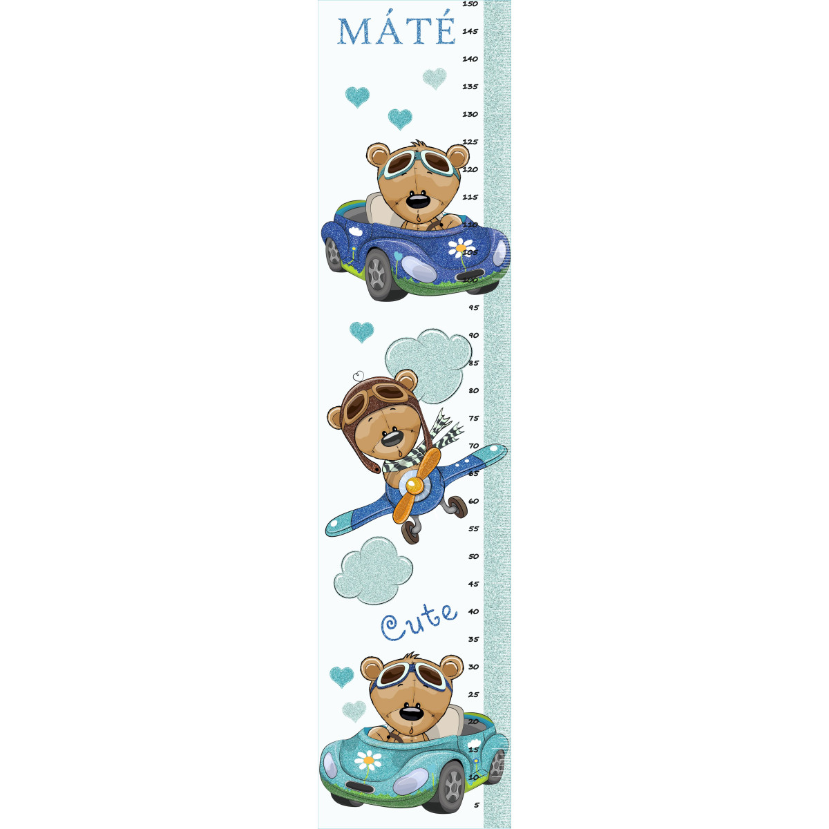 Repülős és autós macis, türkiz, kék csillámos magasságmérős falmatrica, névre szóló | 35 cm x 150 cm