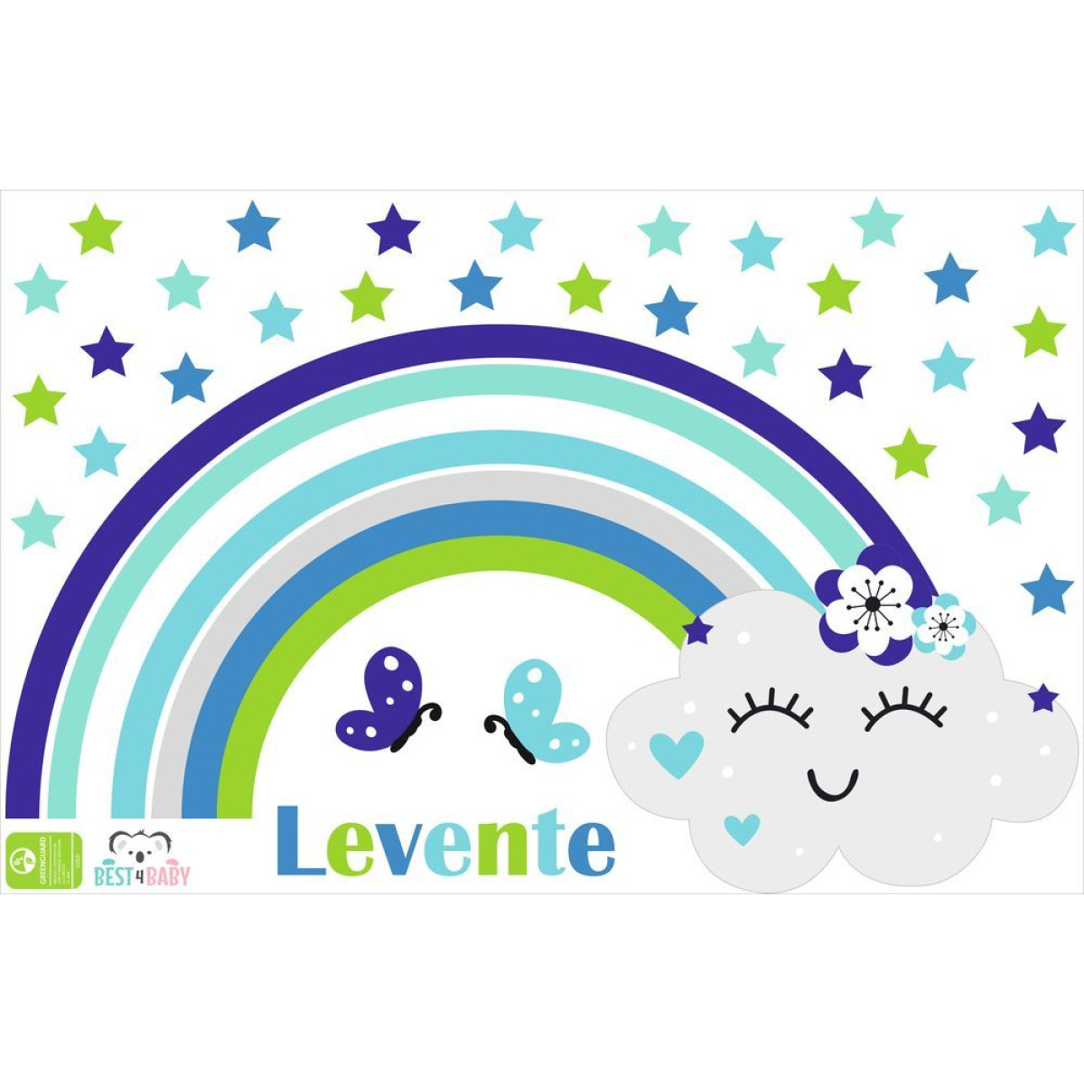 Szivárvány és felhő csillagos, saját neves falmatrica, kék, zöld | 30 + 4 db-os szett | 100 cm x 65 cm-től