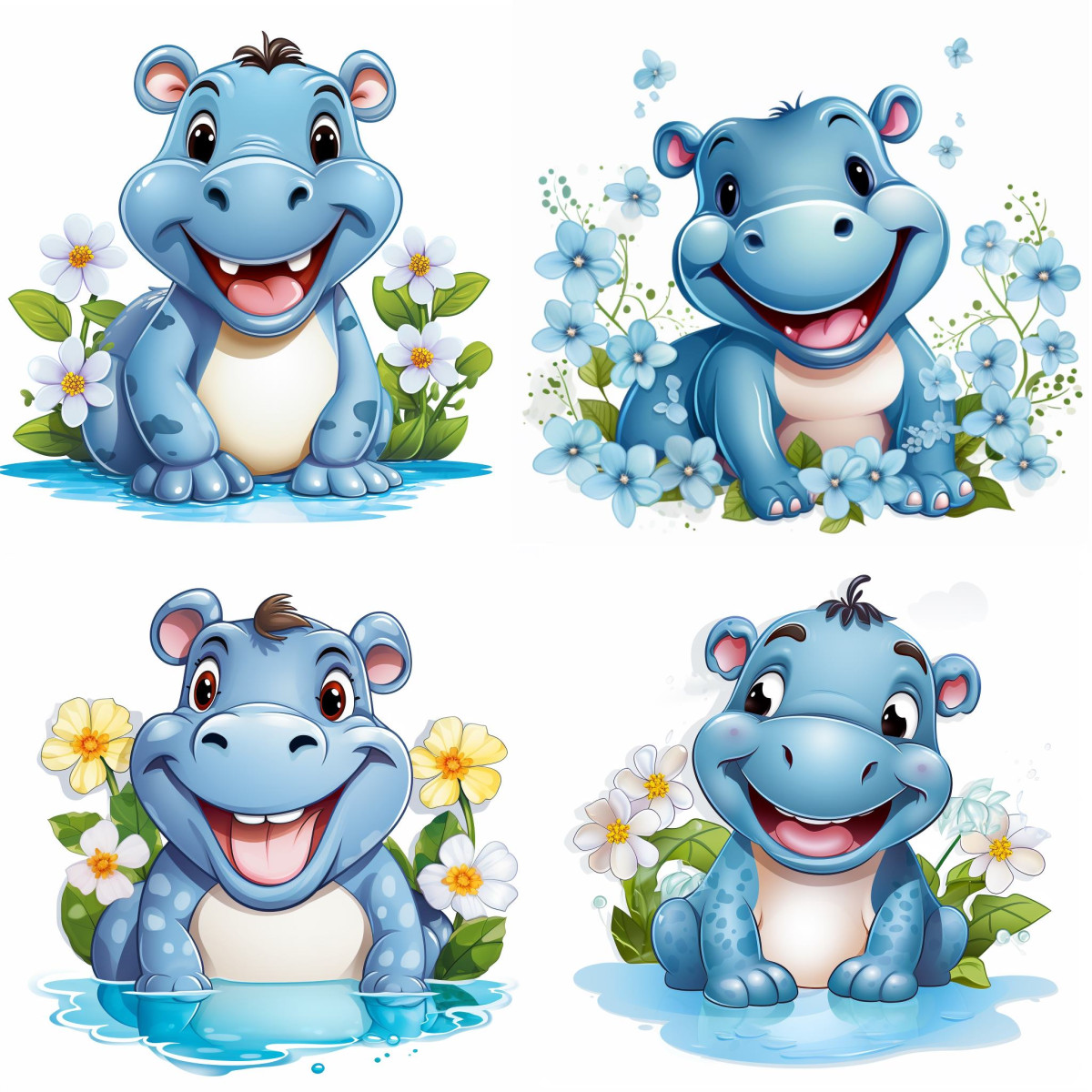 Aranyos vízilovas falmatrica gyerekszobába, fehér, sárga és kék virágokkal díszítve, tóban fürdőző víziló faldekoráció