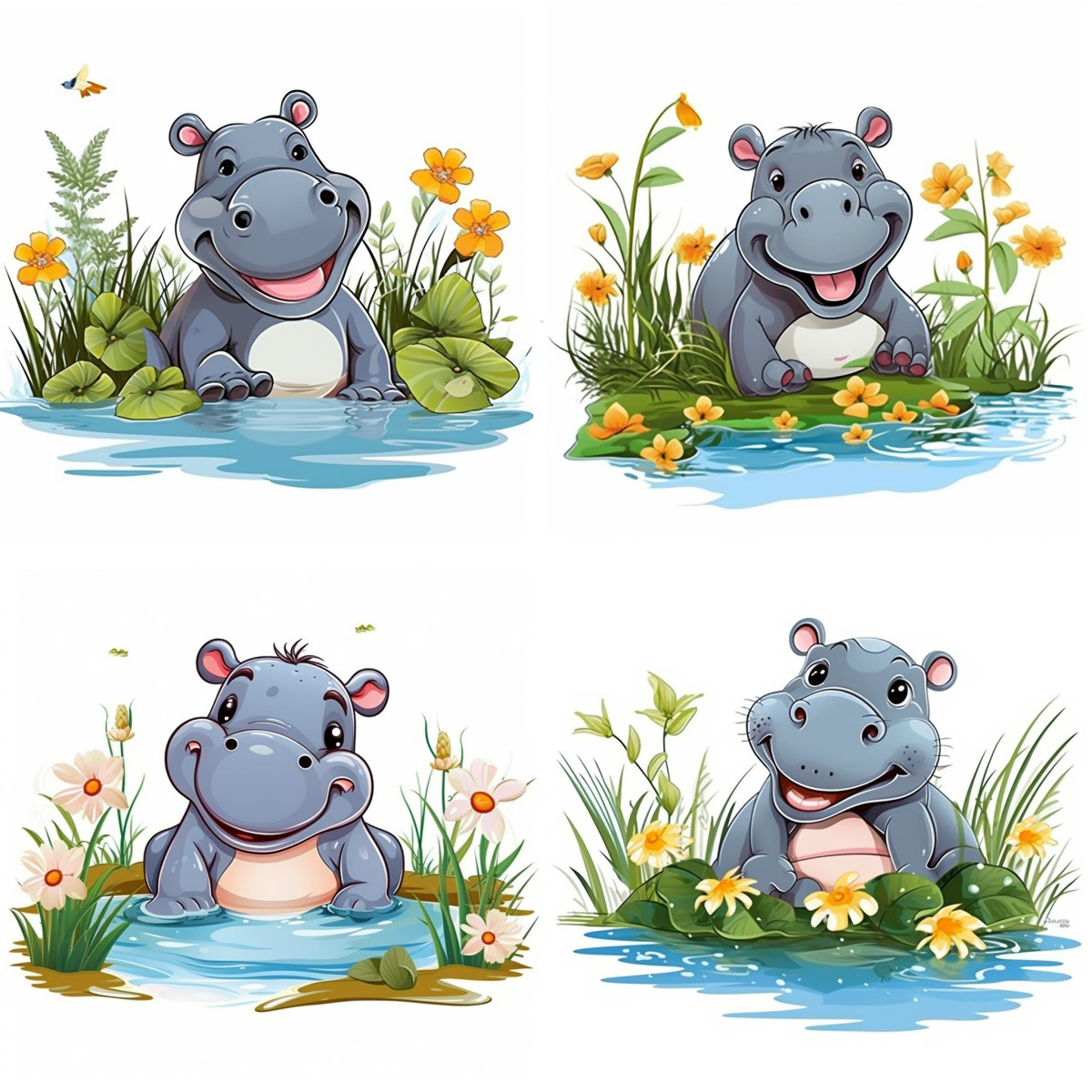 Aranyos víziló fürdik a tóban, körülötte narancssárga és barack színű virágok, falmatrica gyerekszobába